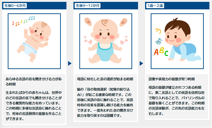 乳幼児の発達に応じて、英語との関わり方をデザインしています。